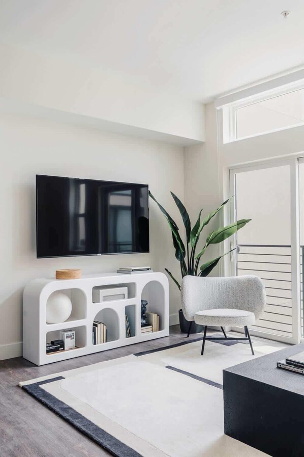 Into the living area, a true masterpiece of functional interior design and resembles a scene from Architectural Digest. The natural sunlight from the floor-to-ceiling windows illuminates the mid-mod eclectic interiors, including the wild Sam Prudden painting above the sofa, and invites you to settle into the deep, comfortable couch for some well-deserved, and oh so needed rest and relaxation. In the mood to binge-watch something excellent? Well, cozy on up because the loft’s 65-inch smart TV comes with a fully-loaded cable package, including HBO.