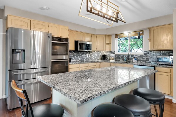 Unwind after a day of sightseeing by cozying up next to one of the home’s inviting fireplaces. Prepare meals with ease in the chef-inspired kitchen, featuring brand-new stainless steel appliances, or fire up the grill on the covered patio for an outdoor dining experience.