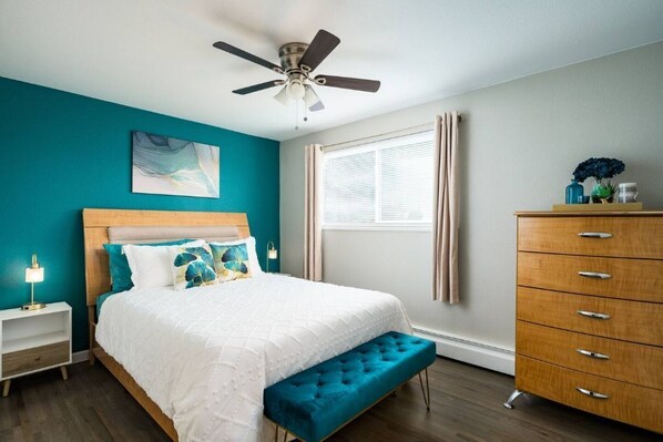 Bright and vibrant bedroom offering a queen bed with memory foam mattress, a closet,and dresser.