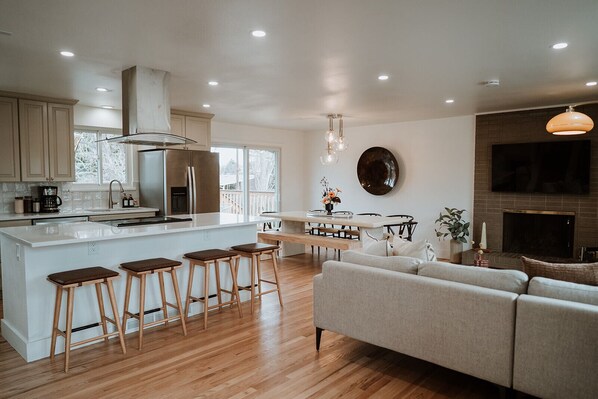 A bright, open kitchen serves as the heart of the home, fully equipped for both simple breakfasts and shared dinners. With stainless steel appliances, a large island, and a dining table perfect for conversation, this space makes cooking and gathering effortless.