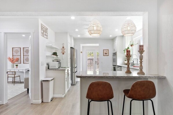 Upon entering this gorgeous home, you will be greeted by the gorgeous, updated kitchen with all new stainless steel appliances! With a double oven there is enough space to cook for everyone! This open concept design then flows into the bohemian inspired living room complete with a flat screen TV and a wooden, nest chair! There is ample amount of seating for your group!