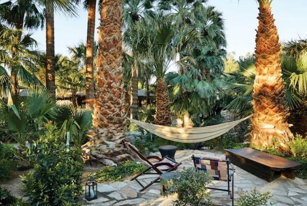 Parking is easy! 1 car can fit in the garage and 3 or 4 more can fit in the driveway. Sunset Springs is in Desert Hot Springs, the next town towards the mountains from Palm Springs and an easy 15 min to downtown or the airport. Grocery stores and businesses are less than 5 minutes away. DHS has easy access from the I-10 freeway to Los Angeles, San Diego and beyond. We are centrally located to Joshua Tree Nat Park, Morongo Casino, Coachella Fairgrounds, and all the rest of the Coachella Valley. We have a relaxed vibe and freedom to enjoy the desert.