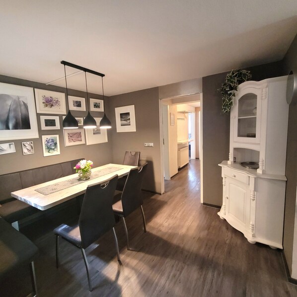 L'appartamento moderno e di buon gusto si trova nel seminterrato della casa. Ha spazio per max. 7-8 persone. Per poter davvero sentirsi bene, il numero di persone 4 non deve essere superato durante un soggiorno più lungo. Nell'appartamento troverete un soggiorno con un'accogliente sala da pranzo e una cucina completamente attrezzata, un bagno con doccia, un WC separato e due camere da letto. Le finestre hanno una dimensione normale e permettono sufficiente luce nell'appartamento. Per motivi di spazio, Mirco onda non è installato permanentemente in cucina. Se vuoi usare un forno a microonde, fammi sapere in anticipo. Posti letto: in una delle camere da letto accanto al letto matrimoniale un divano letto matrimoniale può essere utilizzato come Aufbettungsmöglichkeit. Nella seconda stanza è per due persone, un doppio ponte (1,4 m di larghezza) pronto. Nel soggiorno troverete anche un divano letto per 2 persone. Dal momento che non vi è alcun salotto comune o sala per la colazione nella proprietà, sarebbe conveniente se gli ospiti assumessero principalmente la propria colazione. Nella cucina completamente attrezzata caffè, tè, latte condensato e marmellate fatte in casa sono sempre presenti. Sono felice di subentrare di comune accordo a un servizio di shopping corrispondente per fornire le cose mancanti secondo i vostri desideri. Sulla proprietà ci sono due terrazze che possono essere utilizzate dagli ospiti. Il giardino ospita una casa di fogliame e un pozzo del fuoco. Un piccolo laghetto con un ponte di legno fornisce l'accesso al romantico Laubenhäuschen, che può ospitare 4-6 persone anche in caso di maltempo. Il giardino è utilizzabile per tutti gli ospiti. C'è un totale di due posti auto nel garage doppio e un posto auto all'interno della proprietà. Inoltre, un parcheggio pubblico gratuito è disponibile a 50 metri di distanza.