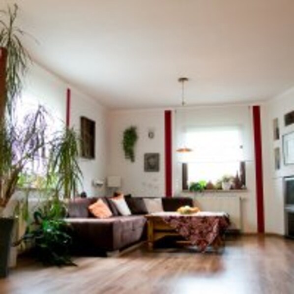 Appartamento molto raffinato al piano terra con attrezzatura completa per un massimo di 4 persone con uso esclusivo di questo appartamento. Nell'appartamento convincere oltre bei mobili, un accesso diretto alla terrazza molti dettagli come immagini e libri e un camino. L'appartamento è composto da soggiorno, camera da letto, cucina e bagno e un ampio corridoio con una biblioteca. Libri e giochi per gli ospiti da usare e divertente insieme. Il soggiorno ha un attrezzature di alta qualità con salottino, TV e caminetto. L'ambiente impressioni complete. Un grande tavolo da pranzo per 14 persone ��� l'ideale di aggregazione sociale. Se necessario, può ospitare fino a 25 persone in soggiorno. Si offre quindi spazio per feste di famiglia più piccoli. Da qui si accede direttamente ad una terrazza e il giardino, che è disponibile per tutti gli ospiti. Oltre al letto matrimoniale nella camera da letto ha un divano letto nel soggiorno di soggiorno per due persone in più. Un lettino pu�� essere posizionato. La cucina al piano terra comprende una cucina attrezzata, lavastoviglie, piano cottura, un tavolo per 4 persone e un forno e un forno a microonde e, naturalmente ricco equipaggiamento di stoviglie e utensili da cucina. Il bagno attraente con una finestra è dotata di una doccia vecchio-in, servizi igienici, orinatoio e bagno per i loro utensili. Poiché non esiste un generale residenza o sala per la colazione in casa, sarebbe utile se il cliente in primo luogo prendere il proprio forniture per la colazione. Nelle cucine completamente attrezzate sono sempre caffè, tè, latte condensato e marmellata fatta in casa a disposizione. Accetto volentieri negoziabile un corrispondente servizio di shopping, per fornire le cose mancanti secondo i vostri desideri. Sulla proprietà ci sono due terrazze che possono essere utilizzati dagli ospiti. Il giardino ospita una casa di fogliame e un pozzo del fuoco. Un piccolo stagno con un ponte di legno fornisce l'accesso alla casa fogliame romantico che pu�� ospitare anche se il tempo per 4-6 persone. Il giardino è disponibile per tutti gli ospiti. Ci sono un totale di due posti auto nel garage doppio e un parcheggio in loco. Inoltre, un parcheggio pubblico gratuito è disponibile a 50 metri di distanza.