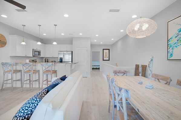 Sea La Vie is a stunning townhome just blocks from the beach! Located in the upcoming, resort-style community of 125 Crystal Beach! This newer townhome features 3 bedrooms and 2.5 baths that can sleep up to 10 guests comfortably! On the first floor, guests will find two guest bedrooms, one with a king bed and one with a full over a full bunk bed, both with patio access. The first floor also has a full bathroom, washer and dryer, and a garage entry. The second floor features a master bedroom with a king bed, ensuite, and walk-in closet. Also on the second floor is a beautiful kitchen with a serving bar, dining room, a living room with a queen-size sleeper sofa, a large flat-screen TV where you can enjoy streaming your favorite shows, and a private balcony with a pool view! You will find granite countertops, stainless appliances, and all new top-of-the-line furnishings throughout this home. Come check out why Sea La Vie will be a family favorite!