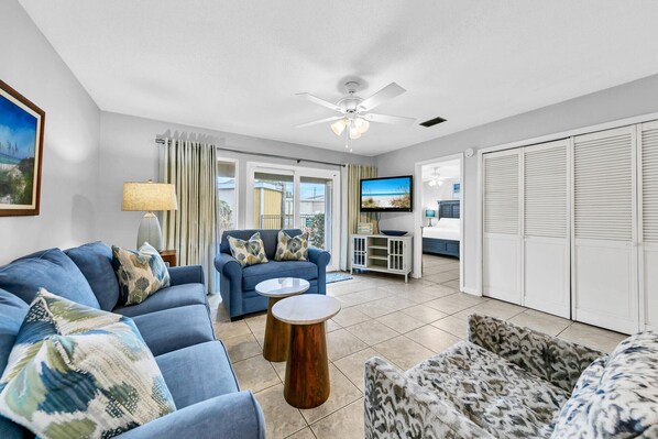 Sali sul fresco pavimento piastrellato di questo spazioso appartamento al piano terra, luminoso e aperto, e ti sentirai iniziare a rilassarti. Apri la porta del patio e sei pronto per fare una nuotata mattutina nella vicina piscina comunitaria riscaldata in inverno. La luminosa cucina bianca offre un bar per la colazione e tutto il necessario per creare pasti indimenticabili per la famiglia. Quando è il momento di riposare, le ampie camere da letto con moquette offrono una piacevole pausa. La rilassante camera matrimoniale presenta un letto king-size e un televisore a schermo piatto a parete, mentre la seconda camera a tema cottage contiene due letti full-size. C'è anche un divano letto matrimoniale nel soggiorno, quindi c'è molto spazio per tutti.