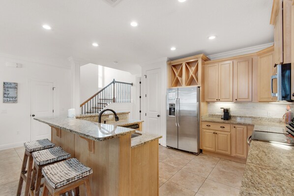 Ci sono 6 TV a schermo piatto in casa - soggiorno, soppalco e ogni camera da letto! I tuoi giochi sportivi, film o musica preferiti possono essere trasmessi attraverso il suono surround del soggiorno. Il soggiorno ha una Smart TV. Grigliare nel patio o bere una birra in cucina con elettrodomestici in acciaio inossidabile, pavimenti piastrellati e ripiani in granito. C'è anche una lavatrice e asciugatrice full size, due posti auto nel vialetto d'accesso, oltre a un parcheggio supplementare a trabocco.