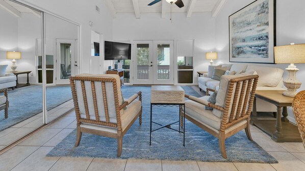 Questa conveniente unità al secondo piano presenta un'ampia zona giorno / pranzo a pianta aperta, a tema isolano, con pavimenti piastrellati e numerose opzioni per sedersi. La cucina bianca ben attrezzata comprende un bar per la colazione ed elettrodomestici inossidabile, completi di tutto il necessario per creare deliziosi pasti o preparare pranzi veloci per una giornata in spiaggia.