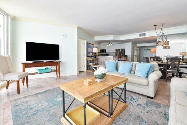 La planimetria open space collega lo spazio abitativo principale del condominio e consente di vedere la spiaggia da qualsiasi luogo tu sia. La zona giorno è arredata in modo confortevole intorno a una TV a schermo piatto e funge da luogo ideale per rilassarsi dopo una giornata in spiaggia. Seduta dietro la zona giorno, la sala da pranzo ha posti a sedere per 4 con 2 posti aggiuntivi disponibili presso il bar per la colazione. La cucina completamente attrezzata è stata rinnovata con elettrodomestici in acciaio inossidabile ed è completamente attrezzata con tutte le pentole e le stoviglie necessarie per preparare i pasti preferiti della tua famiglia insieme. Il balcone è accessibile attraverso la zona giorno e offre una vista non bloccata sulla spiaggia.