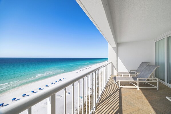 Come enjoy the spectacular ocean views in this gorgeously renovated 9th floor condo with updated furnishings. This spacious 1,430 sq. ft. 2BR/2Bath beachfront unit comfortably sleeps 8 and offers free beach service March 1st through the Sunday after Thanksgiving. (Monthly reservations do not receive complimentary beach set-ups.) The master bedroom has a luxurious king size bed, flat screen TV and floor to ceiling glass doors that open to the 30 ft. balcony overlooking the Gulf of Mexico. Its on suite bathroom has a renovated custom tiled walk in shower and large granite vanity. A newly furnished guest bedroom includes two queen sized beds and a flat screen TV. Dual access from the guest bedroom and dining area lead into a second bathroom with a custom tiled tub/shower and granite vanity. New stainless steel appliances, granite countertops, updated cabinets and a flat screen TV are featured in the fully equipped kitchen. The laundry room offers new full-sized washer and dryer. Accommodations for 10 in the spacious dining area include table and bar seating. A built-in wet bar includes a complimentary large capacity ice machine perfect for filling beach coolers. The living area boasts a huge 65” smart TV, an electric recliner, sleeper sofa and floor to ceiling glass doors leading to the balcony. Private balcony views are exquisite with dining table and chairs, a high-top table and chairs for sunrise coffee and sunset drinks, and 2 loungers. Enjoy listening to music through the outdoor speakers or watching the dolphin and stingray activity easily seen from this 9th floor expansive view.