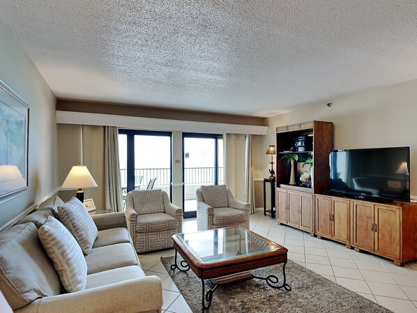 Find relaxation when you stay at Breakers East #505 in the heart of Destin. This Destin, Florida condo rental sits directly on the sugar-white sand with a private balcony overlooking the stunning blue-green water of the Gulf of Mexico. With two bedrooms and two bathrooms, this spacious vacation rental will sleep up to six people easily. Each bedroom also has its own full bathroom. If you are a morning person, the giant, 30-foot private balcony is the perfect place to relax and enjoy a cup of coffee while the sun slowly peaks over the sparkling water in the distance. These breathtaking views can also be savored from the living room and master bedroom. Beach lovers will delight being just steps away from the beautiful beaches of the Gulf Coast.