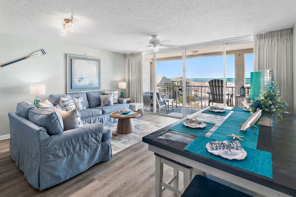 Indulge in the ultimate comfort within the bedroom, where a king-size bed awaits with an abundance of plush pillows. In the inviting living area, you'll find a snug sofa that effortlessly transforms into a queen-sized sleeper sofa, providing extra sleeping accommodations should you need them. The well-appointed kitchen is fully equipped with all the essential appliances and cookware, allowing you to prepare and savor delightful meals throughout your stay with ease. Step out onto your private balcony to experience the true highlight of this condo – the mesmerizing ocean views. Sip your morning coffee as you watch the sunrise over the horizon or unwind with a glass of wine while the sun sets in a burst of colors. The balcony provides the perfect vantage point for dolphin spotting and enjoying the sound of crashing waves.