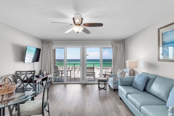 This GORGEOUS beach front condo has been completely renovated and has breathtaking Gulf views from every angle of the kitchen, living room and balcony. Sit on the balcony in the morning with your coffee and evening with a glass of wine and view the amazing Emerald Green waters that is the magic of Destin! This beautiful condo features new LVP or tiled flooring throughout, new kitchen with designer cabinets, solid surface counter tops, stainless appliances, and kitchen bar. It is fully stocked and has everything you need to prepare beach front meals!