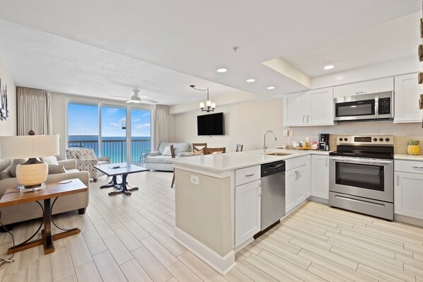 are fully equipped with full-sized range, refrigerator, dishwasher, microwave,