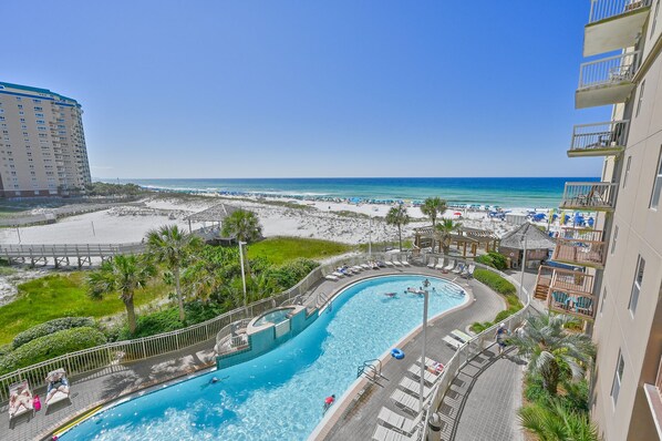 This unit has the best location in popular Pelican Beach Resort. 4th floor is high enough to have a fantastic view of the pool, beach, and the gulf, and low enough to view your teens enjoying themselves in the pool from your oversized private balcony. This unit is the next unit from the corner, giving an unobstructed view of the beach, the gulf and the pool.