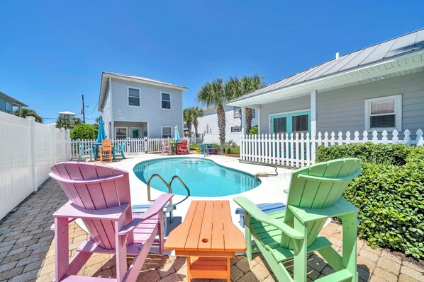 Restin' in Destin is in the PERFECT Close-to-the-Beach Location. Relax on the porches with Gulf views or walk less than 100 yards to the beach to view the gorgeous sugar white sand and emerald waters. This beautifully decorated 2500 sq. ft. 4-bedroom, 4 bath features a main house with 3 bedrooms, 3 baths, a private pool, and a separate cabana with a King bedroom and full bath - perfect for a grandparent getaway or one with small children. With walking distance to many shops, restaurants, and activities, Restin' in Destin is the perfect vacation home!