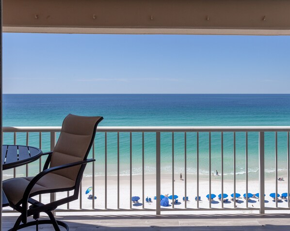 Escape to the peace and tranquility of the Emerald Coast in this beautifully appointed end unit condo. This condo was completely renovated in 2018 and boasts wood plank tile flooring in the main living areas and guest bathroom with new carpet in both bedrooms. You will enjoy picturesque views up the east coast with windows in kitchen, dining room, and living room. Enjoy cooking in this well-appointed kitchen with quartz countertops and high-end stainless appliances. Off the kitchen is a laundry room complete with new full-size washer and dryer. The dry bar has both an ice machine and a beverage fridge. The living area includes a large leather sectional perfect for curling up and watching a movie on the 66" smart TV. The master suite has a luxurious king bed in which you can relax and enjoy the views of the Gulf of Mexico or watch TV on the 56" smart TV. The master bathroom is complete with Carrera marble, custom tile shower and a double vanity featuring quartz countertops. The guest bedroom has two queen sizes beds with a 50" smart TV. The guest bathroom includes an oversized garden tub/shower combo with custom tile surround. Relax on the 30' balcony in the high-end desk furniture perfect for enjoying views up and down the pristine sugar sand coast. Unique to this unit is the updated LED lighting throughout with ceiling fans in each bedroom and living area. This unit offers complimentary beach service March 1st through the Sunday after Thanksgiving. (Monthly reservations do not receive complimentary beach set-ups.) Create lasting memories with family and friends in this spectacular condo.