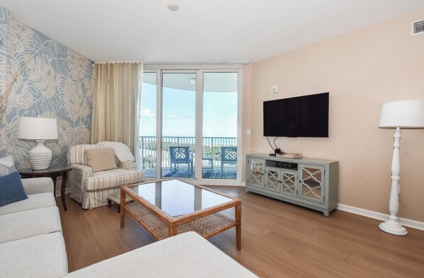 Escape to The Palms of Destin 21213 Junior for your next Destin vacation! This gorgeous 12th floor two-bedroom, two-bathroom condo comfortably sleeps up to six guests and offers the perfect setting for a fun and relaxing getaway. A fully equipped kitchen has everything needed to prepare a delicious meal and to enjoy around the dining table for six with additional seating for two at the bar. Slide open the glass doors and step out onto your private balcony, where you can unwind with views of the gulf and the large lagoon pool, a fabulous spot to sip your morning coffee or wind down in the evening. After a day of soaking up the sun, step into the living area where fun wallpapered walls make for a perfect background. Kick back on cozy furniture and enjoy a movie on the flat-screen TV or gather the group for a cozy game night. Unwind in the primary bedroom which features unique wallpaper, a king bed, flat-screen TV, direct balcony access, and a private bathroom with a tub/shower combo. The guest bedroom includes a full bed and is just steps away from a second bathroom with a spa-like walk-in shower. For added conveniences there is also a sleeper sofa in the living room, a washer and dryer, complimentary WiFi, and full access to The Palms of Destin’s resort-style amenities, everything designed to make your vacation seamless and stress-free. Make everlasting memories at the ultimate Destin beach vacation experience at The Palms of Destin 21213!