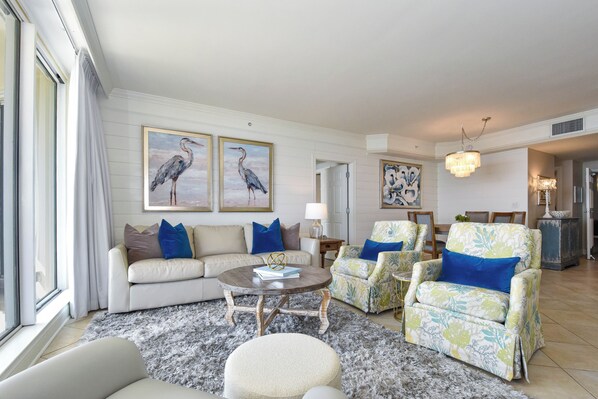 La camera da letto principale comprende un letto king size, una TV a schermo piatto, una spaziosa cabina armadio e un accesso privato al balcone fronte Golfo. Il bagno principale comprende una vasca idromassaggio e una cabina doccia.