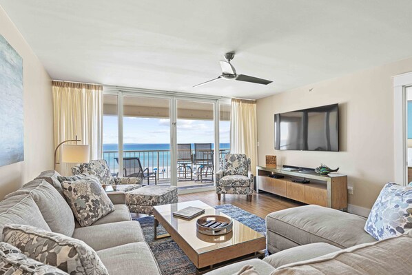 Condo 205 is completely updated and professionally decorated, with high-end furnishings, fixtures and finishes throughout — including all-new Samsung kitchen appliances. This is a spacious 2 BR/2 BA beachfront condo with a private 30-foot balcony and reserved indoor parking spot. It features the latest technologies: a 70" TV in the living room with a 2.1 wireless sound bar and 55" TVs in both bedrooms. All three flatscreen TVs are wall-mounted and "smart" with digital HD service and Blu-ray players. Both bedrooms contain an iHome alarm clock with wireless speakers and charging ports. The new wet bar includes a built-in dual-zone wine cooler, ice maker and a commercial-grade blender. The kitchen has granite counters, stainless steel appliances, and a full-size washer and dryer. The master bedroom has a king bed that looks out onto the Gulf and features a memory foam mattress topper. The large master bath has a custom walk-in doorless shower. The guest bedroom has two queen beds and a custom tub/shower in the bath. There are double sinks and premium granite tops in both bathrooms along with outlets on each side of the vanities. You can also enjoy free beach service March 1st through the Sunday after Thanksgiving. (Monthly reservations do not receive complimentary beach set-ups.) The condo is equipped with WiFi, three ceiling fans, and many modern touches. Maximum: 6 people. If you're looking for luxury, top-of-the line amenities and a great view of the beach (without sacrificing privacy), you will appreciate unit 205.