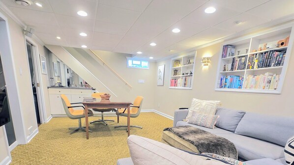 One spacious upstairs Bungalow bedroom (queen bed), one main floor cozy bedroom (queen bed), full kitchen with stainless appliances (plus air fryer, instapot and more), quiet upstairs living room with comfy couch and piano, basement movie den with flat screen, Bose speakers, and sauna.