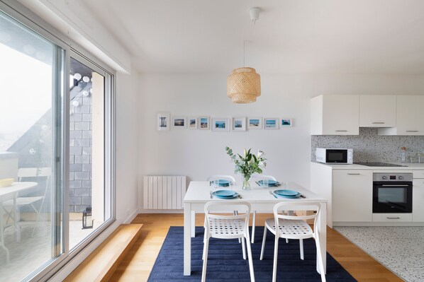 It offers unobstructed views over the rooftops of Dinard. It can comfortably accommodate up to 4 guests. It consists of a living room, an open-plan kitchen, a bedroom and a bathroom.
