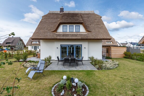 La nostra casa con tetto di paglia "Maison Mer Baltique" è arredata con molto amore e con il fascino della Provenza. Disposta su tre piani, offre spazio sufficiente per un massimo di 6 persone con sauna, camino, 3 camere da letto e 3 bagni. L'intera casa vacanze è dotata di riscaldamento a pavimento. Su una superficie di circa 600 m², le 3 terrazze sui lati est, sud e ovest possono essere utilizzate individualmente in qualsiasi momento della giornata. C'è un piccolo tavolo da bistrot con due sedie da bistrot per la piccola colazione mattutina, mobili da terrazza per mangiare insieme o indugiare e una sedia a sdraio per rilassarsi e sentire la sensazione del Mar Baltico. I nostri ospiti possono utilizzarla da fine aprile a metà ottobre.