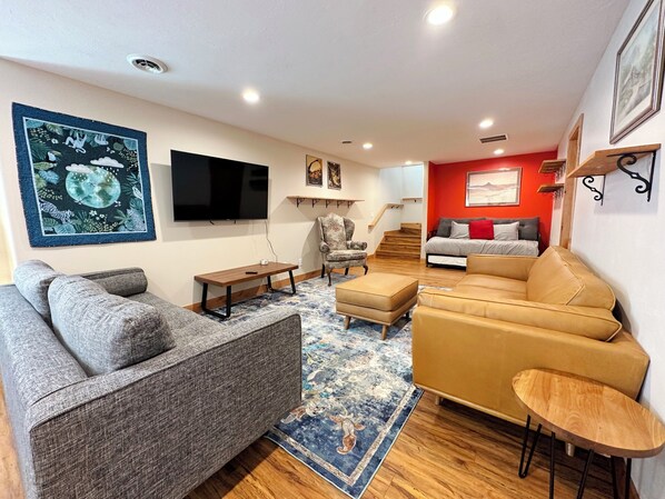 Shared Living Space (Basement) - King bed, queen bed, twin-size daybed with twin-size trundle; shared hallway bathroom.