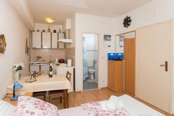 This lovely studio apartment is equipped perfectly to accommodate two people. It features free WiFi, air-conditioning and a flat-screen SAT TV, well equipped kitchen with dining area and spacious living room. Kitchen is well equipped with an oven, stove, refrigerator, water kettle and kitchenware. Private bathroom features shower, hair dryer, toilet paper, soap and washing machine. Ironing facilities, linen and towels are provided.