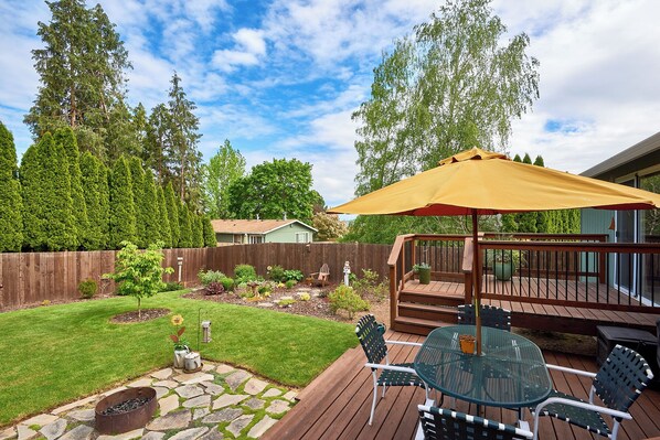 Un cortile recintato splendida ti trasporta in paradiso. Con un sacco di spazio per rilassarsi all'aria fresca Oregon. Un ben curato ponte dispone di un angolo cottura per il caffè del mattino, tavolo ampio patio e un barbecue grill per mangiare all'aperto, e il parco che circondano la casa sono appena paesaggistico e con giardino. Non dimenticare di vagare fuori nel proprio giardino di nidificazione per un momento di pura felicità.