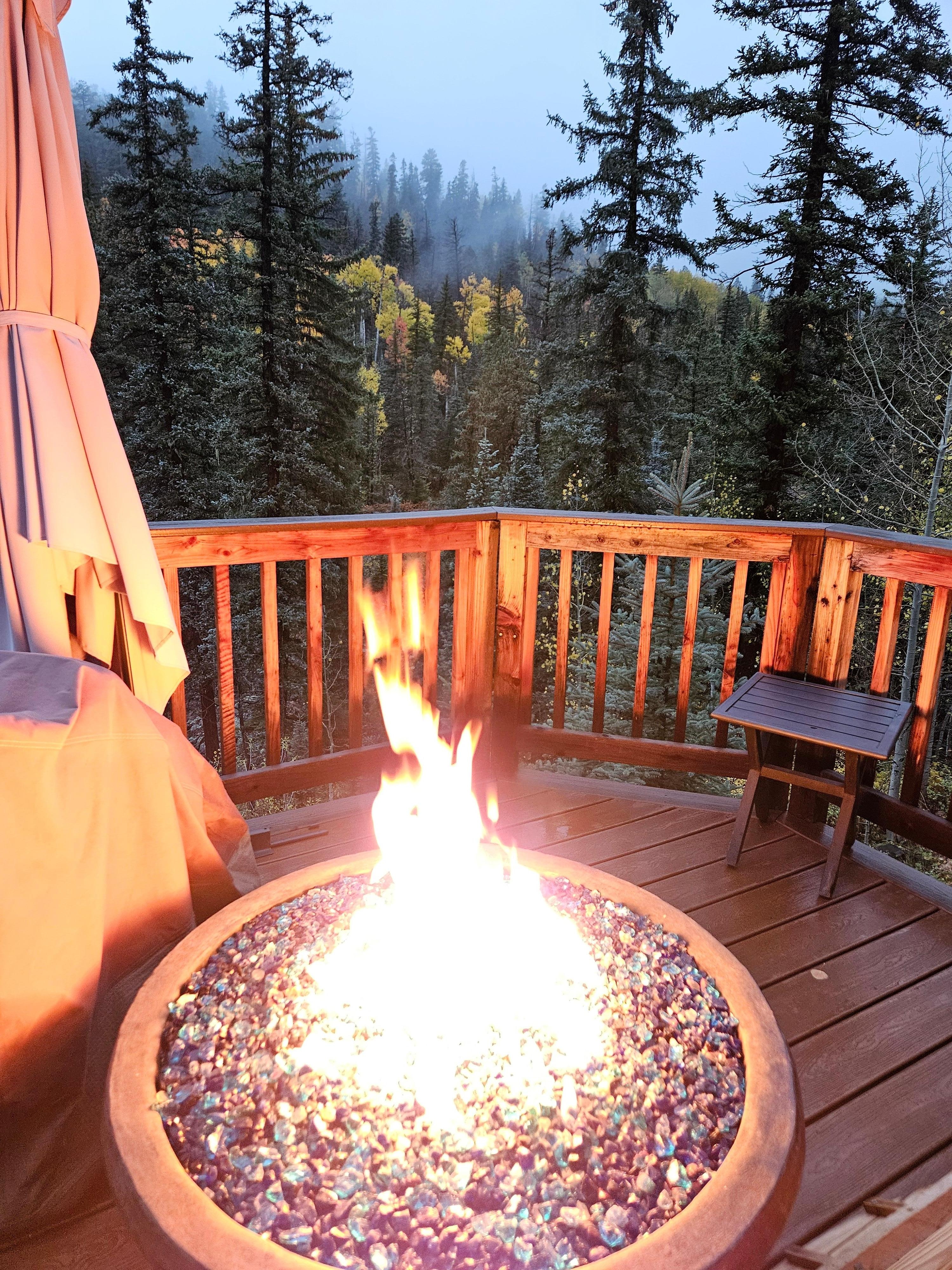 Le finestre del soggiorno su ciascun lato del camino in pietra del fiume si affacciano anche sull'acqua corrente del torrente Cascade. Non saprai dove stare e prendere tutto. Bene - sì lo farai - il mazzo è semplicemente fantastico! Il tempo qui a 8800 piedi sul livello del mare è 10-15 gradi più freddo rispetto a Durango a soli 25 minuti di distanza - non vorrai entrare!