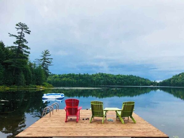 On this beautiful property, you will find a large dock with Muskoka chairs, good for you to enjoy the lake view, swimming (around 5 feet at the end of dock) and fishing. There is an expanse of sand toward the waterfront and a small beach is offered for easy access to the water. The lakebed is soft and silty underfoot and there is some weed so water shoes are recommended. Canoe, Kayaks, a Jon boat, and 4 Stand-up paddling board are available for water sports activities. There is a firepit with outdoor chairs and picnic table - the perfect place to roast marshmallows and enjoy some bed-time stories for the children. The lake is small and there is agreement among the owners to restrict the use of motor boats to maintain the tranquility of the environment.