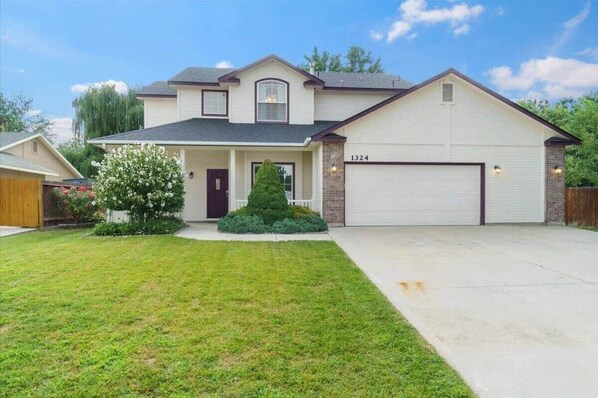 This beautiful, newly remodeled Eagle home accommodates 8 people comfortably in its 4 bedrooms and 2.5 bathrooms. With one bedroom on the main level and the other three upstairs. Stunning open floor plan, great for  family entertaining. Comes with a fully stocked kitchen to allow ease when cooking from home. Full size appliances including refrigerator, stove, oven, dishwasher, microwave and coffee maker. With a fire place and 70 Inch flat screen smart tv. Two couches make for plenty of seating. The dinning room table seats 6 and has leaf to extend to fit 8 or 10. The backyard has a propane bbq and table for outside dining. You’d be happy to know that this location is walking distance to Eagle’s bike park and Eagle’s hiking trails. Two minutes from grocery store and 3 minutes to downtown Eagle. Along with a short car ride to neighboring cities, 10 minutes to Meridian and 5 minutes to Boise.