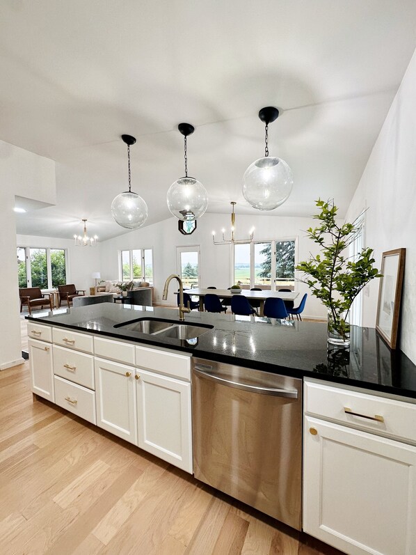- Spacious and fully stocked kitchen, with modern stainless steel appliances , dishwasher, stove, microwave and other kitchen appliances for your cooking need .