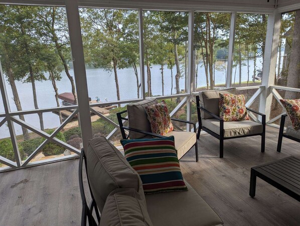 This stunning home boasts a breathtaking lakefront view and is located in the perfect cove overlooking Lake Oconee's big water. With five bedrooms, there's plenty of room for families to spread out and enjoy their lake time. The screened-in porch overlooking the lake and ample outdoor space provide the ideal setting for paddle boarding, kayaking, and playing on the lake mat, which can keep kids entertained for hours. The fully-equipped kitchen, complete with outdoor grill, provides everything you need to enjoy a delicious lakefront meal. The basement is also a great place to hang out with a big-screen TV, board games and air hockey table- perfect for any indoor entertainment. The dock is a relaxing place to enjoy the views or even try your hand at some daily fishing. Despite feeling peaceful and secluded, the grocery store is only a 15-minute drive away, and the dollar store (which has everything you could need and more!) is just 5 minutes away. Whether you want to be active or just relax and read a book on the porch, you won't have to worry about mosquitoes. The bunk room downstairs is perfect for kids, while the master-on-main and kitchen both offer stunning views of the lake through large windows. This truly is the perfect getaway!