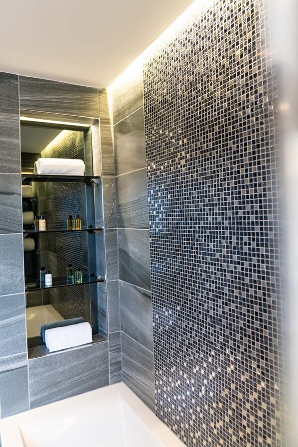 Bathroom: With large shower cubicle, large bath, toilet and heated towel rail and lots of storage.