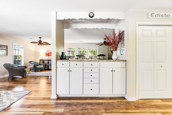 Great spot and had everything we needed for a long weekend. Huge pull-through parking area made maneuvering our boat/trailer a breeze. Check-in and key retrieval requires a trip to the Vacasa office (no electronic door lock) but not a huge deal because the office is conveniently located on the way into Edisto. We'd definitely stay here again.