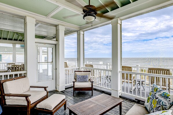 Luxe oceanfront home with dazzling beach views, screened porch & elevator