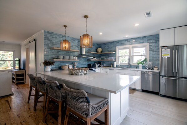 Full of coastal charm and unique design, this home features an open-concept living and dining area, a well-equipped kitchen, and cheerful beachy décor throughout. The spacious sun deck is perfect for morning coffee or evening cocktails, while the fenced-in backyard provides a safe and private space for your four-legged family member to roam.
