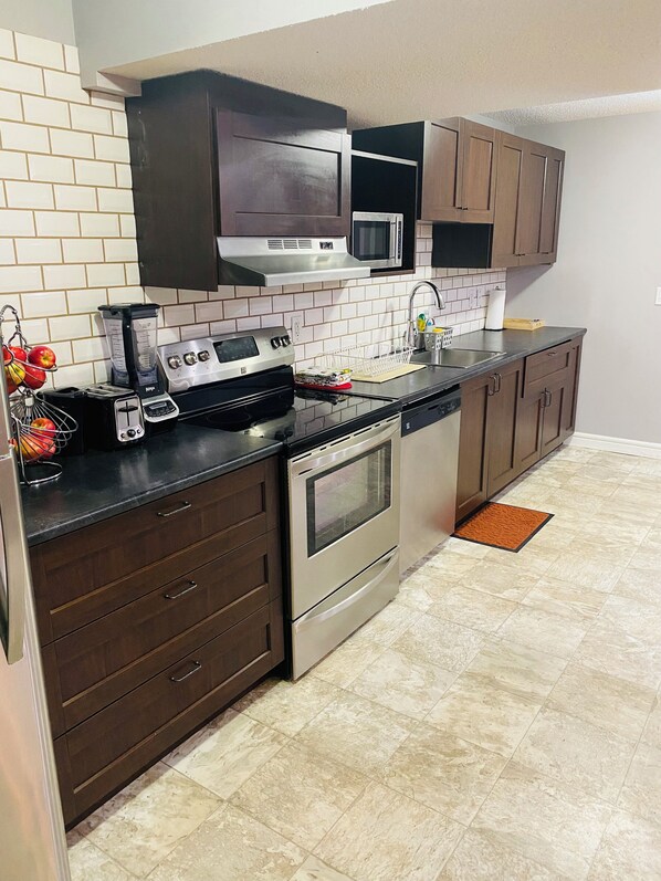 - Our basement suite features a large living area, 1 full sized modern bathroom, spacious bedroom with King size bed and a fully equipped Kitchen