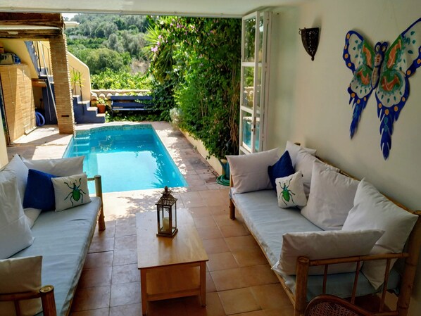 Questa è la nostra casa vacanza. Nel momento in cui l'abbiamo visto, ce ne siamo innamorati e speriamo che lo farai anche tu. La casa è stata restaurata circa 10 anni fa ed è un luogo confortevole dove soggiornare con molti tocchi tipici marocchini come il patio interno per rinfrescarti; basso, rilassato sdraiati nel soggiorno e finestre chiuse con balconi di Giulietta. Vi è abbondanza di spazio esterno per tutte le condizioni atmosferiche - luoghi soleggiati e luoghi ombreggiati; vista attraverso un aranceto fino a un piccolo ruscello e la valle terrazzata di fronte; la piscina, un bagno e una doccia all'aperto e tutto molto privato.