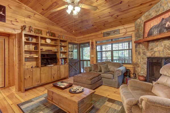 Fai il tuo prossimo viaggio nelle montagne della Georgia del Nord in questa baita rustica e dog-friendly a Ellijay, perfetta per un soggiorno in famiglia o in coppia. Accomodati vicino al camino a legna mentre trasmetti uno spettacolo o un film sulla nuova Smart TV, prepara il tuo pasto preferito in cucina o godi un po 'di aria fresca sul ponte mentre prepari il pranzo o la cena sulla griglia a gas.
