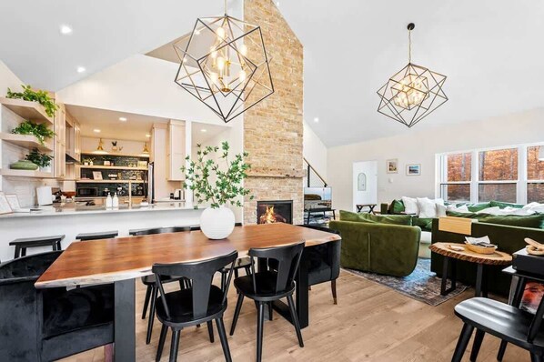 The open-concept living space is both inviting and functional, perfect for gathering after a day of adventure. Relax by the gas fireplace, spin some vintage vinyl, or watch your favorite shows on the smart TV. For those seeking a quiet workspace, a dedicated desk with Starlink Wi-Fi ensures you can stay connected if needed.