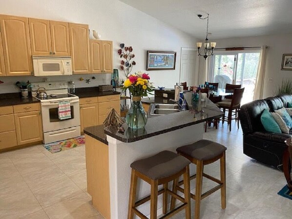 La grande sala vi invita a rilassarvi su un comodo divano e due poltrone. È possibile guardare la TV o un film su un televisore a schermo piatto 50 ". Vi è anche un lettore DVD, stereo, audio surround, film, libri, puzzle e giochi. Oppure si può semplicemente godere la vista del lanai e piscina.