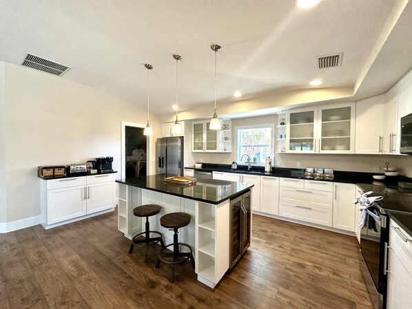 Ben arredato, presenta arredi e decorazioni puliti e confortevoli con una divertente atmosfera costiera. Spazio abitativo a concetto aperto con pianta divisa, che offre agli ospiti molta privacy. Una grande sala grande vi accoglie con una TV a schermo piatto e molti posti a sedere per la famiglia e gli amici. Appena fuori dalla zona giorno c'è uno studio accogliente con un camino elettrico, dove puoi leggere il tuo libro preferito o semplicemente sederti e rilassarti! La moderna cucina completamente fornita presenta elettrodomestici in acciaio inossidabile, ripiani in granito e armadi bianchi. Sorseggia il tuo caffè mattutino al bar della cucina mentre fai compagnia allo chef. Un sacco di gadget e strumenti da cucina rendono la preparazione di deliziosi pasti per le vacanze un gioco da ragazzi, mentre una grande isola centrale offre un ampio spazio sul bancone.