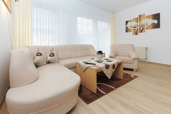 Dimensioni: circa 90 metri quadrati soggiorno cucina camera da letto seconda camera da letto separata / camera per bambini terza camera da letto separata / camera per bambini bagno con doccia, vanità e servizi igienici Parcheggio al piano terra (riservato) ottimale per 1 a 5 persone Accesso a Internet tramite WLAN disponibile (gratuito, soggetto a variazioni) disponibilità al sole lavatrice e asciugatrice a disposizione / uso comune su richiesta Biancheria da letto e asciugamani inclusi Lettini per bambini, seggioloni e carrelli gratuiti Su richiesta, è possibile anche pulire l'alloggio stesso all'arrivo, quindi non è previsto alcun costo di pulizia