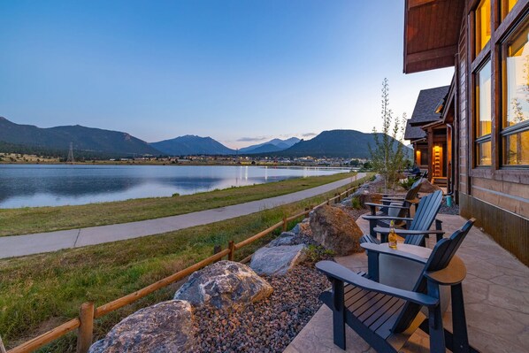 Spanning 1,577 square feet, Cabin 9 features two luxurious master suites, a spacious balcony, a loft, and a living area dominated by a striking 25-foot-tall fireplace. The state-of-the-art kitchen and dining area are perfect for preparing and enjoying meals, while the BBQ grill and patio with an additional fireplace and a 6-person Jacuzzi make outdoor dining and relaxation a breeze. Dramatic floor-to-ceiling windows, extending 25 feet, provide panoramic views of the lake and Colorado Rocky Mountains. Double patios offer extra outdoor space to soak in the scenery and spot passing elk.