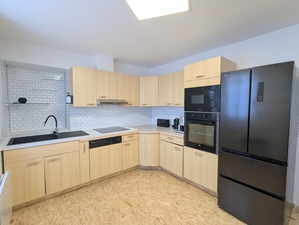 Living area (25 m²): a welcoming space with an open-plan kitchen. Amenities: refrigerator with freezer compartment, oven, microwave, dishwasher, 3-burner induction hob, bean-to-cup coffee maker, kettle, toaster, raclette and fondue sets.