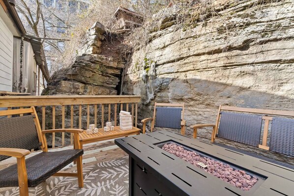 Back Deck: A more private retreat, tucked against one of Eureka’s iconic stone bluffs. Enjoy string lights, comfortable seating, outdoor games, and a propane fire pit—the perfect place to unwind after a night out.