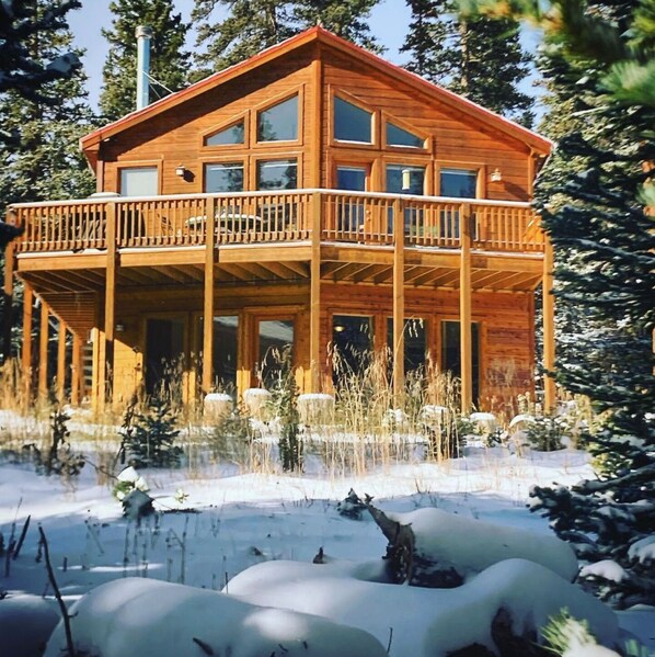 Enjoy watching the snowfall from the warmth of the hot tub, sled down the drive, snowshoe, or snuggle by the pellet stove. The lodge is perched at 11,300ft and is in an area lovingly nicknamed "Valley of the Snow". The cabin offers three bedrooms, two full baths and is fully equipped with all kitchen/cooking necessities, bath linens, fresh sheets and Starlink high-speed wi-fi. One queen and the bunk room share the upstairs bath. A thermostat controlled wood pellet stove offers a real flame fireplace. Downstairs there is a queen bedroom with a floor furnace, and a full bath across the hall. For the extra kiddos, there is a double size futon just outside the room. The downstairs media area offers four recliners and a smart TV which sits on a faux fireplace that heats up for those cozy movie nights. Stream Netflix, Hulu, etc. A gas fireplace (also thermostat controlled) also keeps the downstairs extra warm. There’s also a game table with a few provided games for fun family time. There is a door to the whole downstairs suite, so you can close off the entire downstairs for a more private space. The hot tub is tucked under the deck and in winter you can guarantee that it's surrounded in snow! Watch for satellites and find the Milky Way on a clear night! There is a trailhead at the end of our street, another around the corner. The one at the end of the street opens to 360 degree views and will lead you to the top of a 13ner! (That is a local term for a mountain that's above 13,000ft). There are TONS of fishing spots nearby, and in town there is even a place to ice fish. You can rent snowshoes in town and hike around the cabin since it sits on an acre, or any of the gorgeous nearby trails. If you get hungry there are several small restaurants in town and in Alma. Or head to Breck for a full array of choices. If relaxation is your goal and you want something different, the hot springs in Mt Princeton about 45 min away is a very cool experience. It's our goal for the cabin to be a place of happy memories and we hope your stay is as warm and cozy, or cool and adventurous, as possible! Sleeps 10 in beds, but if your party is larger than 6, we may not be able to accommodate, so please inquire directly. The area is serene, and the views in the area are spectacular. Pine, aspen and spruce trees fill the acre lot, provide privacy and offer wildlife a place to wander. As the name implies, this amazing cabin is located just near where the trees stop growing, at about 11,300 feet in elevation, so AWD is required in winter so that you have enough grip to easily get up the driveway.